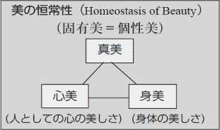同様に、「美の恒常性」も「真美・心美・身美」などの3つの美の三角形が(Homeostasis triangle of beauty)によって健康美が維持されます。これが本物の美しさであり、「美の真価」です。
