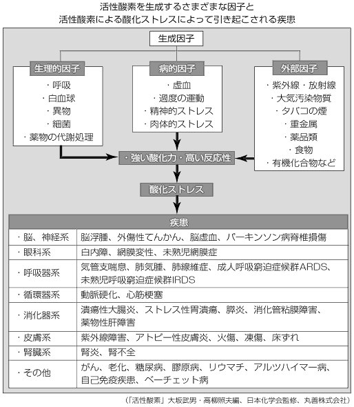 一方、三大成人病と呼ばれ死因の上位を占めるがん・心臓病・脳卒中をはじめ、糖尿病・白内障・痴呆症・肝炎・腎炎・痛風・肺気腫など、感染症を除いた病原菌によるあらゆる疾患のほとんどの発症に、活性酸素が関係していると考えられています。さらに老化が進み、抗酸化能力が低下すると、活性酸素の毒性はさらに増し続けることとなります。