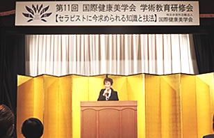 ![]() 講演 『 健康美のための姿勢と動き 』 ![]() 東京国際大学人間社会学部人間スポーツ学科准教授 医学博士 早川洋子先生による「健康美のための姿勢と動き」の講演を伺い、良い姿勢は美しさや健康にもつながっていて、正しい姿勢こそが健康美の基本であることを実感しました。 正しい姿勢、良い姿勢には、 1.外見の印象を左右する→変えやすい 2.美しいボディーラインづくり 3.けがを予防したり、疲労しにくいなど、様々な動作に影響を与える 4.腰痛を予防する 5.内臓への負担が少ない 6.若さやエネルギーなど、年齢を反映する このような良い効果があるそうです。 そして、会って2~5秒で決まると言われる第一印象をアップする効果もある美しい姿勢は、特に人前に立つお仕事をされている方であれば、とても大事なポイントですね。 ところが、その良い姿勢をキープすることは難しいことでもあります。 身体の片側だけ使う姿勢をとるくせによって、身体が歪んでいることも多いようです。 例えば、日常の動作でいうと… ・足を組む時、上にする足が決まっている ・床に横座りをするとき、左右どちらかに足を出すかが決まっている ・かばんや買物袋を持つ手が決まっている ・横を向いて寝る時、右向きか左向きかが決まっている などです。 さらに、現代は、生活の便利さゆえに、骨や筋肉が衰え、重力に対して無理のない直立姿勢(良い姿勢)がとれない人が増えています。 それにより、ダメージを受けやすいのが「腰」です。 今や、日本人の健康寿命を阻害する要因の2番目が「腰痛」だそうです。 脊柱は、背部の壁と腹圧に支えられて保護されており、それは自然のコルセットの効果があるそうです。 つまり、日頃から意識しておなかに力を入れておくことが、たるみのない美しい姿勢を保つことにつながるということです。 ![]() 講演の中で、実際にO脚の矯正法を教えてくださいました。 両手を前に伸ばし、両足を揃えてまっすぐに立ちます。適当に折りたたんだバスタオルを両ひざの間に挟みます。そして、背筋をまっすぐに保ちながら、90度の角度まで、ゆっくりとスクワットを行います。8回程度でOKです。 確かにモデルさんの足の形に変化が見え、参加者の皆様からは声が上がりました。先生によると、一過性のものではありますが、根気よく2種間ほど続けていると自分のものになるそうです。 意識一つで、常に美しい自分でいられるなんて素敵なことですね。 ぜひ、実践して美しい姿勢を手に入れたいものです。 研究発表 『 韓国の皮膚美容師国家資格制度に関する研究 』 ![]() 仁川才能大学校美容芸術科教授 理学博士 郭眞瓊先生には、韓国で国家資格として認められているエステティックの資格の実態について詳しく教えていただきました。 韓国では、2008年1月1日より国家技術資格法による美容師資格が、一般美容師と皮膚美容師(エステティシャン)に区分されました。それに伴い、同年10月5日に実施された第1回目の皮膚美容師国家試験は、スキン・エステ市場の拡大を見越してか、予想を大きく上回り15万人が受験したそうです。皮膚美容師の需要の増加も相まって、その後も資格取得者の数は安定して増加しています。2013年の国家技術資格統計年報によると、2012年に韓国の35歳~44歳の女性が取得した上位10種類の資格の中で、皮膚美容師が23.9%、一般美容師が22.4%と、共に高い取得率を示しており、人気のある資格であることがわかります。 ![]() そして、ドイツなどの先進国の資格制度を参考にして、量ではなく質の高い専門性を持ち現場に適した皮膚美容師の養成を通して、皮膚美容師の社会的地位の向上を願っていると締めくくられました。 講演 『 望ましいセラピストのあり方とテクニック 』 ![]() 昭和大学医学部薬理学兼任講師 医学博士 株式会社村山代表取締役 少子化が社会問題となっている今日ですが、同時に平均寿命の延びによる高齢者の健康維持、医療費の増大などの問題も深刻さを増しています。 我が国にとって疾病の予防は重要な課題であり、エステティックに通うことで健康的に痩せることができれば、エステティシャンも生活習慣病の予防や健康維持に貢献できるはずです。 エステティシャンは、国家資格がなくても従事できる仕事です。そのために、これまでは仕事に必要なスキルや標準的なレベルというものも、あまり明確ではありませんでした。 村山舞先生の講演は、エステティシャンの仕事をもう少し広くとらえ、ヨーロッパでいうところのセラピストとして位置づけて、これからのあり方を問いかけるものです。 ![]() 講演では、初めてサロンを訪れるお客さまへの気持ちのよい接客や、痩身プログラムを継続するためのやる気を維持するために、コーチングをどう活かしていくかについて具体的な解説がありました。 エステティックを単なる美容の一つの仕事ではなく、健康的に美しくなることを支援できるやりがいのある職業、誇りのもてる仕事にしていきた
