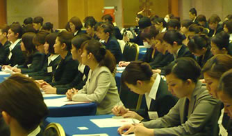 人には、最初の印象を重ねていこうとする脳の動きがあり、初めに悪い印象を持ってしまうと、その後の行動や事柄を全てマイナスに結び付けようとしてしまうそうです。また、第一印象は、出会いの瞬間から5秒で決まると言われており、そして、その後の印象に大きな影響を与えます。 だからこそ、第一印象が大事なのですね。 お客様は、この第一印象を含めて、はじめの15秒間で、対面した人の印象を決めてしまうそうです。これを、接客での「真実の15秒間」( Moment of Truth )と呼ぶのだそうです。 この15秒間を挽回するには大変な時間と労力を要し、またその15秒間には真実の姿があるとも言われています。まずは、接遇者である自分が、常に100点満点の15秒間を伝えることがとても大切だということですね。 続いて、人の印象を決める5大要素とされている「挨拶」、「表情」、「態度(立居振舞い」、「身だしなみ」、「声色」について、ペアワークを交えながら、講義は進みました。 最後に、参加者全員に先生から問いかけがありました。 多様化するお客様の期待に応え、マインドシェア No.1 になるために、自分自身がもう一歩頑張ることは何ですか?という質問です。 例えば、言葉遣い(敬語を磨く)や、マナーを学び知識を得るなど、それぞれが思いついたことを文字にして表現していました。 そこで、続いて先生が、それでは、それをどのようにして手に入れますか?と質問されました。 つまり、これは自分のコンプレックスをクリアするためのキャリアプラン(アクションプラン)作りであって、そのコンプレックスをクリアしていくことが成長につながるのですと説明してくださいました。 こうして2時間の講義は終了しました。 それぞれが、接遇者としての課題に気付くことのできた充実した時間でした。