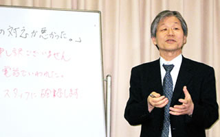 講義の中でも対応手順の説明がありましたが、それを目の前で実際のやりとりのデモンストレーションをみせていただきました。うまくいかなかった今までのやり方との違いがはっきりと分かります。このデモンストレーションで「クレームを言うお客様」を演じて下さったご参加者の方が、演じながらどのように気持ちが変化するかを説明して下さいました。