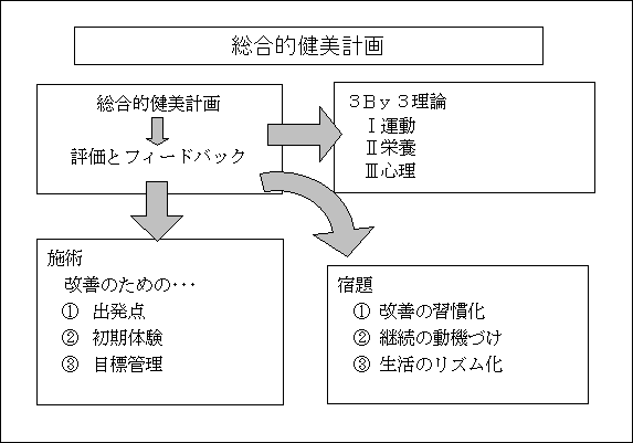 総合的健康美学論の実践は、「総合的健美計画」によって行われます。計画の実施は「面接及び施術」、「3By3理論」、「宿題」などによって構成されます。