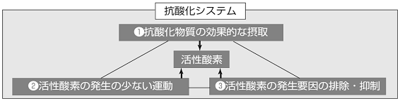 この項では酸化を防ぐための、システムづくりの基本を学びます。抗酸化システムとは、運動、栄養、心理のバランスをとるための「3×3理論」を、根底からじっくりと支える生活システムの基本です。抗酸化システムの構築には、次の3つの要素があります。