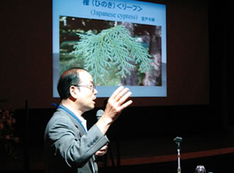 浅井先生の講義は、会場に檜のリーフから抽出した精油を室内にスプレーし「森林浴」を体験することから始まりました。
